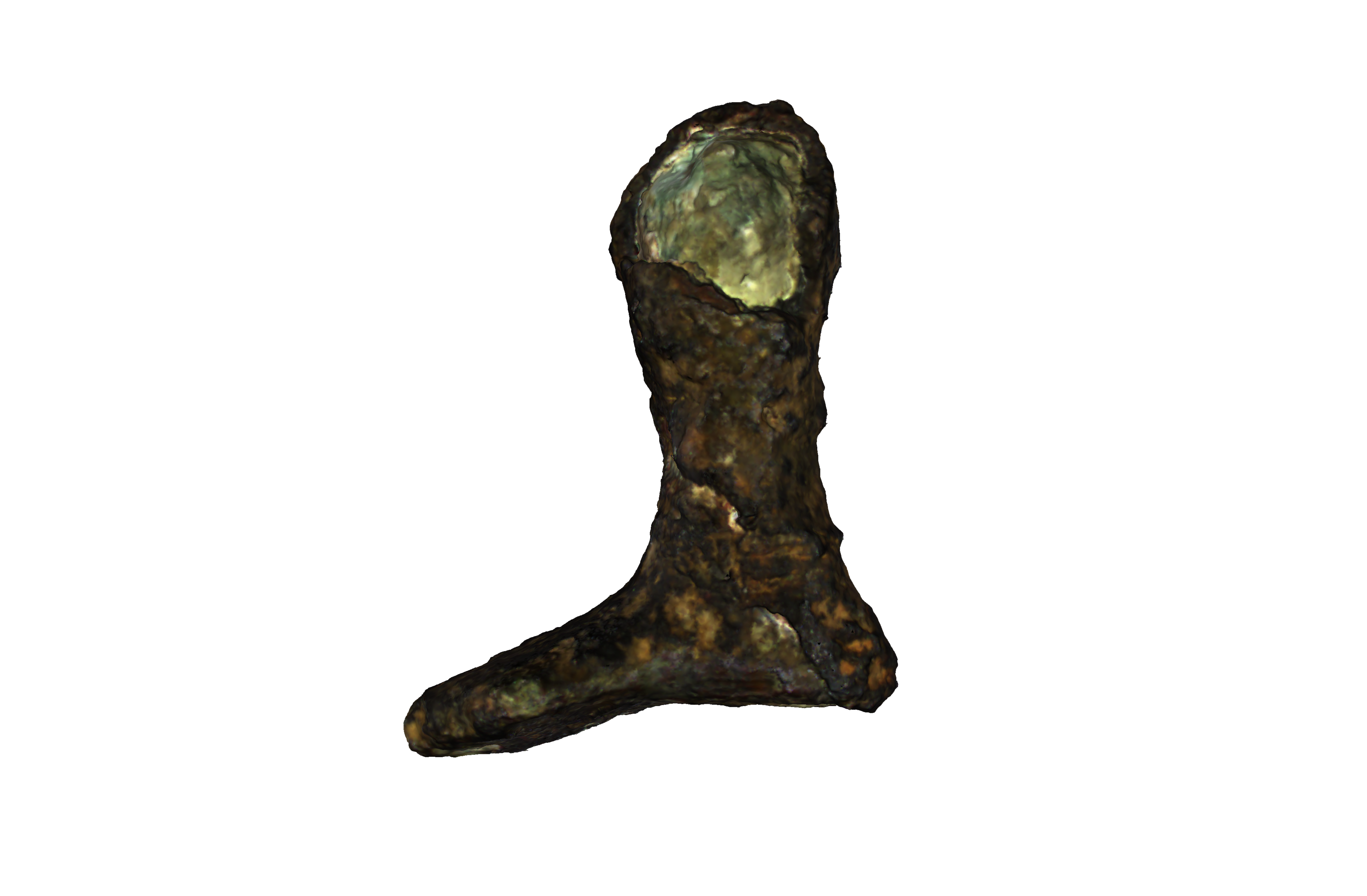 This bronze element belongs to the category of ex voto - statuettes donated to the divinity to ask for protection - was found in San Pietro Montagnon (today Montegrotto) in the late 19th and early 20th century. The area, already known in antiquity for the beneficial properties of its thermal springs, was a very important place of worship since the 8th century B.C. and a religious reference for the entire venetic world for a long period: the objects donated by the faithful can be dated between the second half of the 8th century to the 3rd century B.C., when the sanctuary was merged with the cult of the Roman god Aponus. The ex voto exposed in the Museum are bronze copies of anatomical elements - an arm and a leg - but they do not represent an exception in the panorama of votive statuettes. The use of making objects that refer to a part of the body is much more ancient and widespread throughout the Mediterranean world and it is functional to a specific request to be made to the deity or as thanks for help received; in both cases it concerns to a cult certainly linked to the sphere of health and healing.