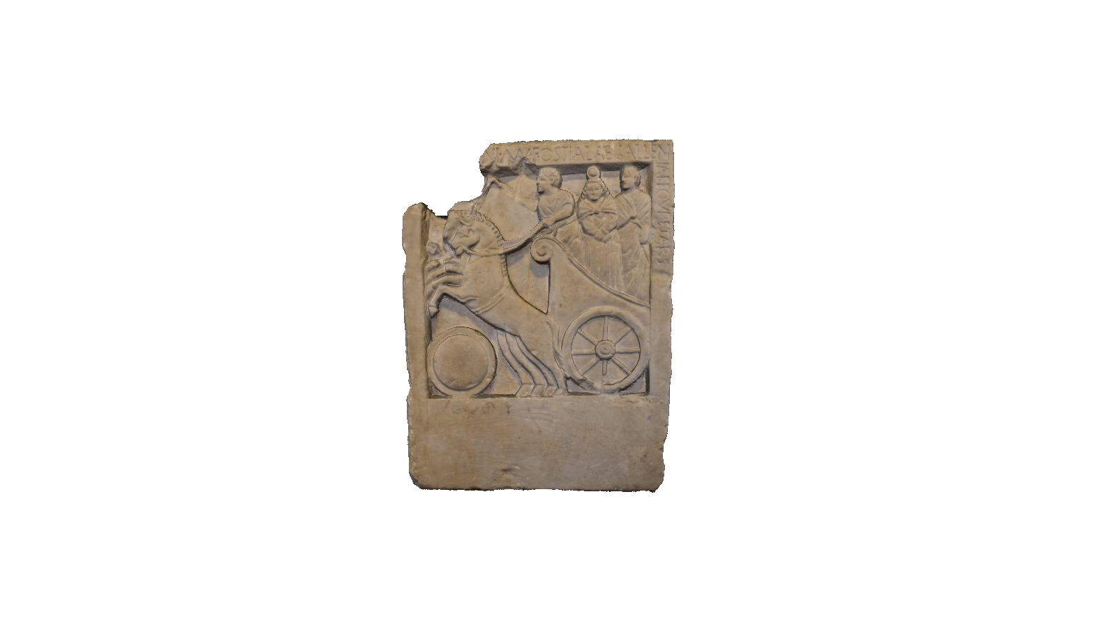 The Stele was found in 1962 in Via San Massimo, Padua, during an emergency excavation. It is a funerary monument made of limestone from the Berici Hills, and in the central mirror, using the bas-relief technique, three figures standing on a chariot drawn by a pair of horses are illustrated, a classical scene that refers to the journey to the afterlife. The first figure is the charioteer: a man placed in profile, wearing a simple tunic and holding the reins to lead the animals. Behind him are a woman and a man, probably a husband and wife. The man wears the toga, the high-ranking attire of Roman men, while the wife is still in a much more traditional type of iconography, with elements in common with older depictions: she is shown in front, wearing a long-sleeved striped tunic and a cape over her shoulders held by a clasp, and on her head she wears the symbolic disc of Palaeovenetian high-ranking women. There is also a disc under the horses' legs: it is a circular shield, a variant on the typical plant figures placed in the same place in the venetic stelae.