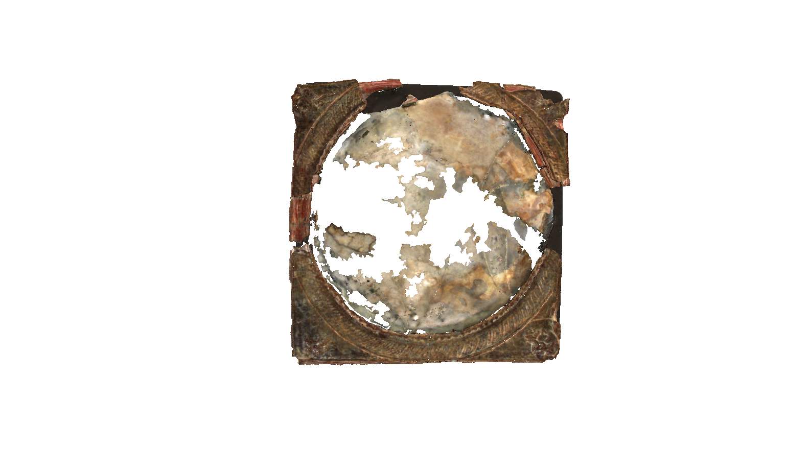 The small mirror belongs to a yet little-researched class which, as of today, is made up of about 2000 specimens dated from between the 1st century AD and the Byzantine period, peaking in the Mid-Imperial Roman Period.Where preserved, their glass surface is irregular and convex, backed by a thin coat to provide a reflective effect. Three concentric bands of different width are arranged around the central opening: a narrow beaded band (1.3 mm mean width), a wider band with an oblique line decoration (3.9 mm mean width) and a smooth outer cord that touches the outer square rim (0.5 mm mean width). The spaces at the corners are occupied by male heads: top right is a left-facing adult or mature Silenus (Papposilenus) (h 5.9 mm; w. 5 mm); bottom right is a young Bacchus or Satyr, also facing left (h. 6.1 mm; w. 4.2 mm); bottom left is Pan facing right (h. 8.5 mm; w. 5.7 mm). The top left figure is difficult to identify due to the many missing sections; the unaltered areas suggest a right-turned bearded man wearing a wide-brimmed hat (h. 4.9 mm). The distances between these decorative elements are as follows: 39.9 mm from the base of the top right head to the top of the bottom right one; 51.3 mm from the top of the bottom right head to the tips of the horns of the bottom left head; 42.5 mm from the tip of the horns of this figure to the base of the top left head; 47 mm from the base of the top left head to the base of the top right head.