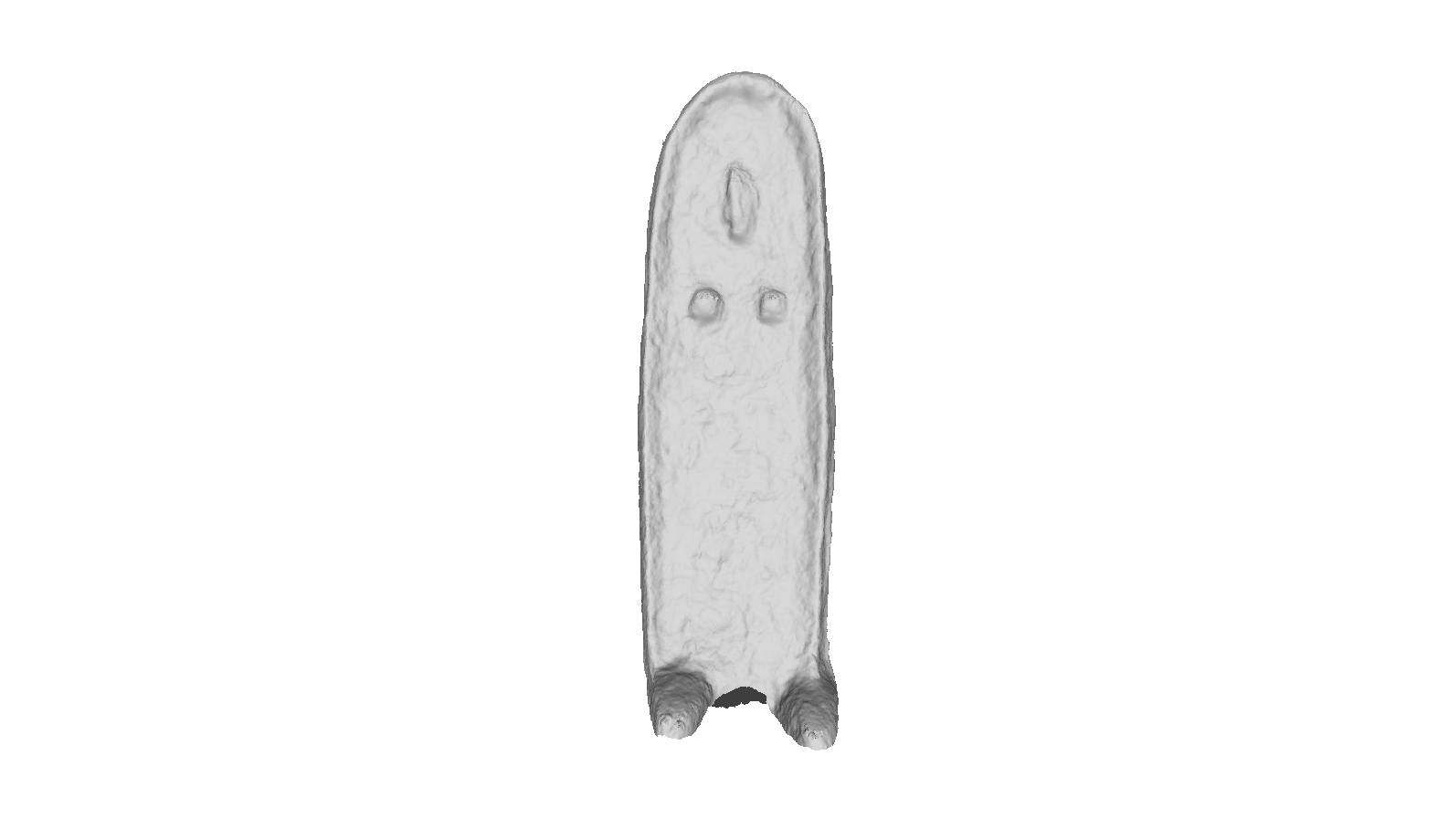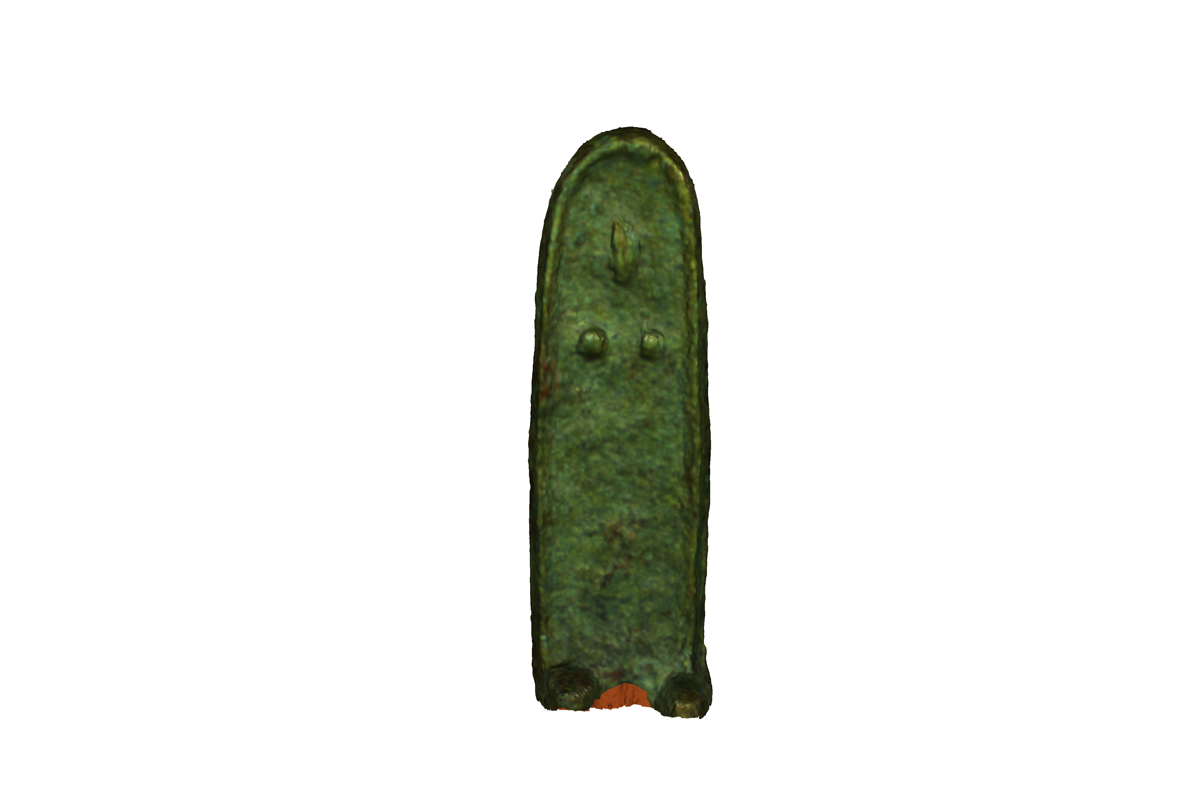 The bronze statuette has the shape of a stele: flat and with a rounded top, smoothed at the back while the front is more irregular. It represents a female figure facing frontally, covered by a long cloak that leaves her feet uncovered, disproportionate to her body, and with only the outline of her nose and breasts recognisable.